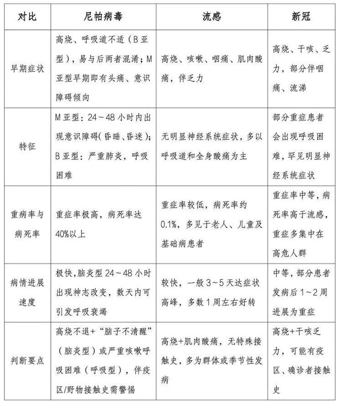 专家提醒:如果只是单纯发烧、咳嗽,大概率是普通感冒或流感;但如果高烧不退,还伴随“脑子不清醒”或严重呼吸困难,同时有疫区旅居史、野生动物接触史,就一定要立刻就医,并主动告知医生相关接触情况,这是尼帕病毒的重要信号。