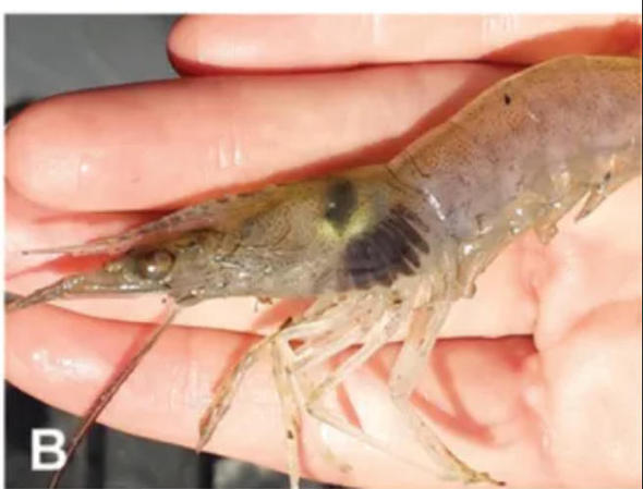 在水质差、溶氧低的环境中,受伤的虾容易感染细菌或真菌,导致其鳃组织坏死并出现黑色沉积。